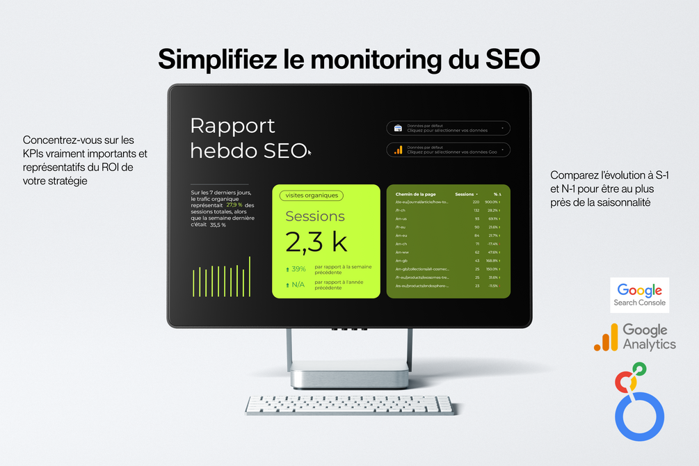 - Donnez à la direction ou à vos clients un résumé ultra-clair : trafic, visibilité, conversions et variation S-1 et N-1 s’affichent en grand. En 30s, vos décideurs savent si le SEO avance ou recule.
